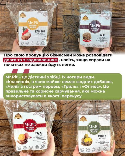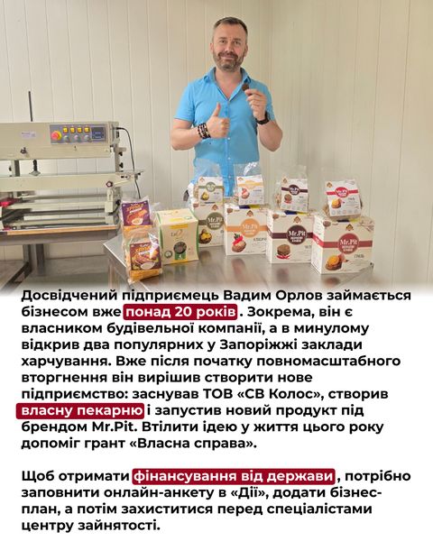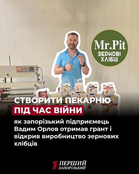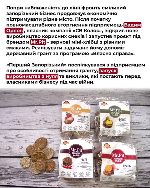 Попри наближеність до лінії фронту сміливі запорізькі підприємці продовжують економічно підтримувати рідне місто. Після початку повномасштабного вторгнення запорізький підприємець Вадим Орлов, власник компанії «СВ Колос», відкрив нове виробництво корисних снеків і запустив проєкт під брендом Mr.Pit – зернові міні-хлібці з різними смаками. Реалізувати задумане йому допоміг державний грант за програмою «Власна справа».